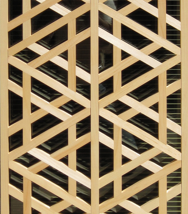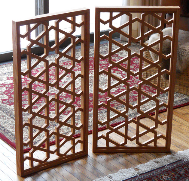The design reproduced in these lattice panels is one of the gems of Islamic art, almost one thousand years old. This design is found through most of the ancient world, from Andalusia to ancient Persia and Mughal India. It can be found as a frieze, incised ornament, small window lattices of stone or spectacular wall sized lattices. The proportions of this lattice are taken from a window lattice in the great mosque at Cordoba, begun in the eight century (CE) and remodeled into the eleventh. The original window lattice is carved in marble; almost all existing examples of geometric window lattices are carved from stone or stucco.