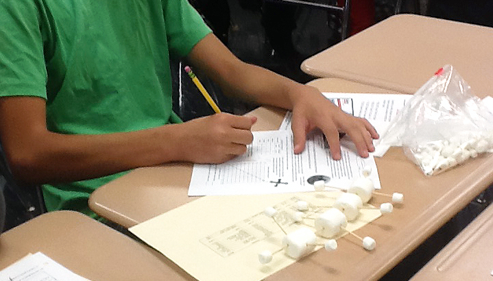 Give students, in pairs, the supplies. They should each have 4 big marshmallows, 10 little ones, and 10 toothpicks.